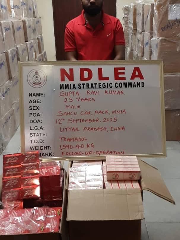 The tramadol shipment worth Three Billion Nine Hundred and Ninety Million Naira (N3,990,000,000) in street value was imported from Delhi, India, disguised as multi-vitamins in 114 cartons and arrived the import shed of the Lagos airport on an on Ethiopian Airline flight on Monday 8th September 2025.
