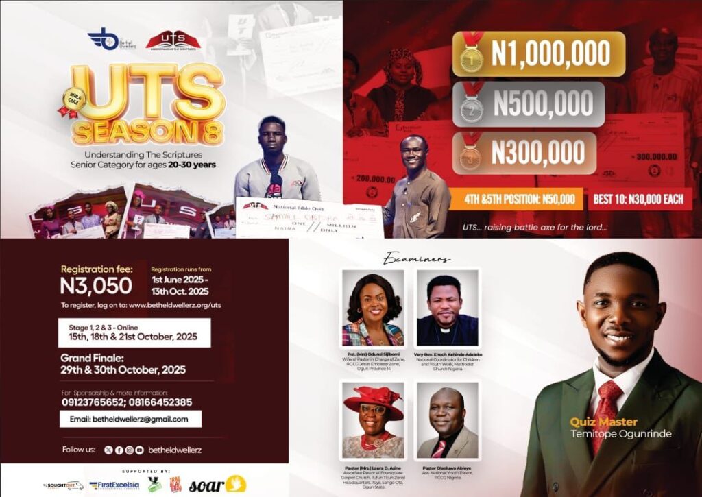 Registration is now open for UTS Season 8 – Understanding The Scriptures (UTS), Nigeria’s premier Bible knowledge competition for youths aged 20 to 30. Organized by Bethel Dwellerz, this highly anticipated annual event aims to deepen participants’ understanding of Scripture while fostering a spirit of healthy competition among Christian youths nationwide.