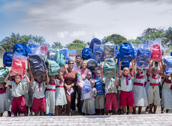 Some beneficiary pupils display their new school bags, uniforms and writing materials following the class...