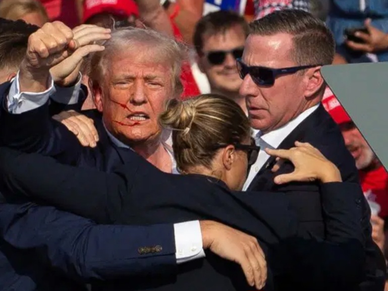 Then Republican candidate Donald Trump is seen with blood on his face surrounded by secret service agents as he is taken off the stage at a campaign event at Butler Farm Show Inc. in Butler, Pennsylvania, on July 13, 2024, after being hit in the right ear in an apparent assassination attempt by a gunman. Photo by Rebecca DROKE / AFP.