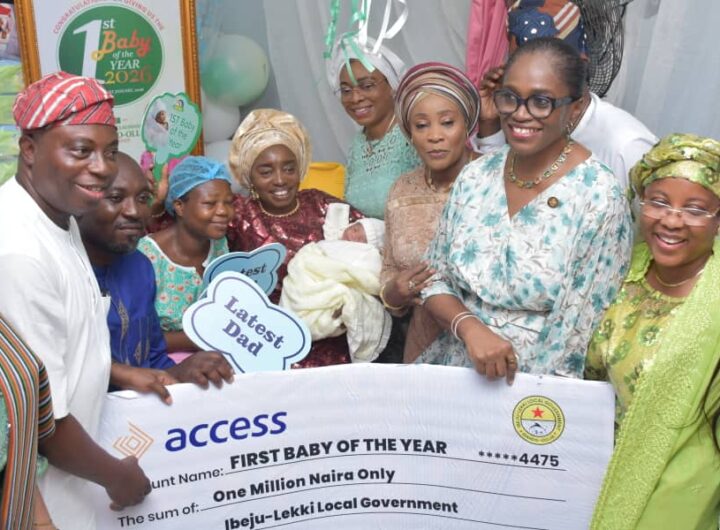 L-R: Chairman Ibeju-Lekki LGA, Hon. Abdullahi Olusesan Olowa; Parents of the first baby, Mr. and...